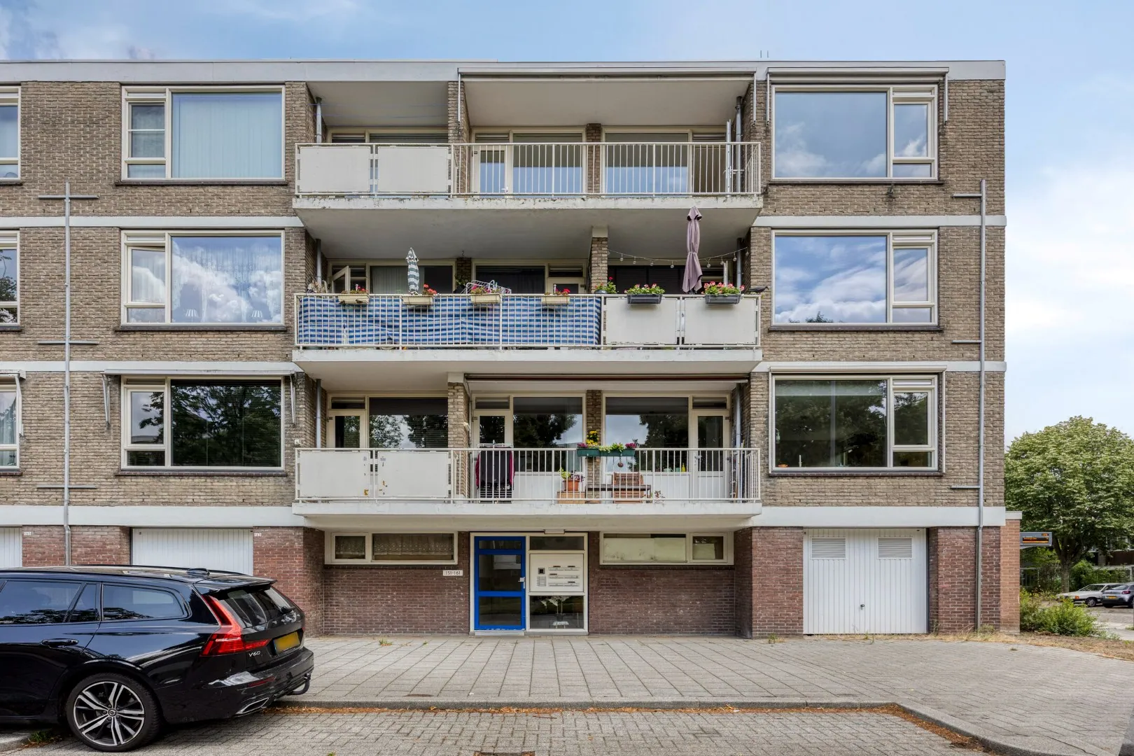 Afgesloten portiek met brievenbussen en bellentableau. Toegang tot het trappenhuis en de ruime berging.