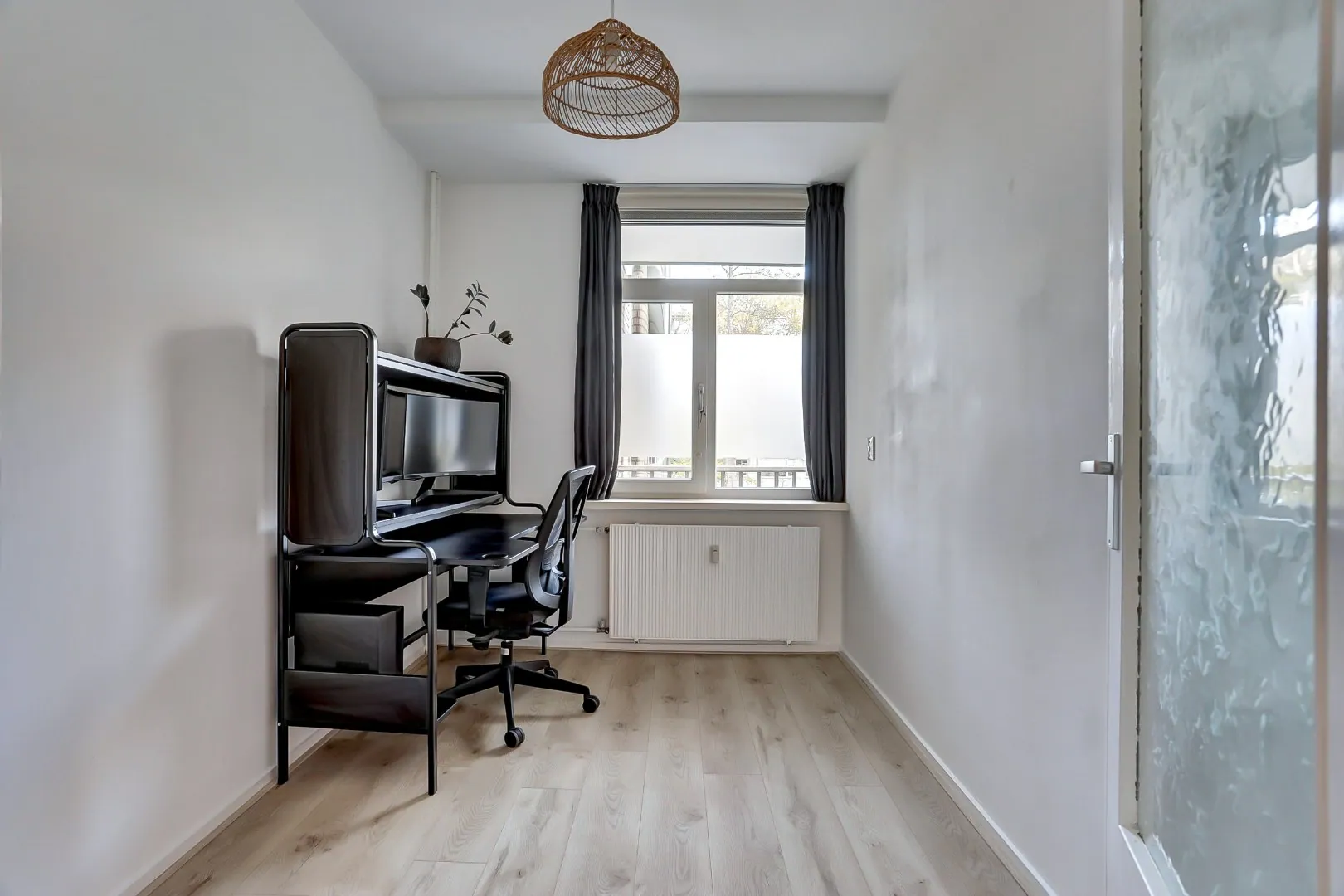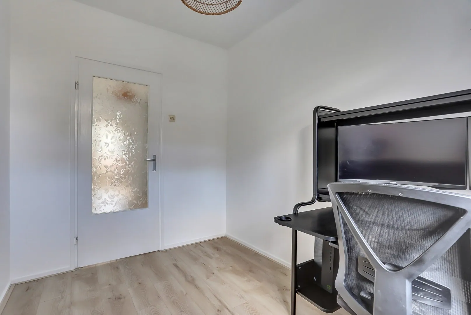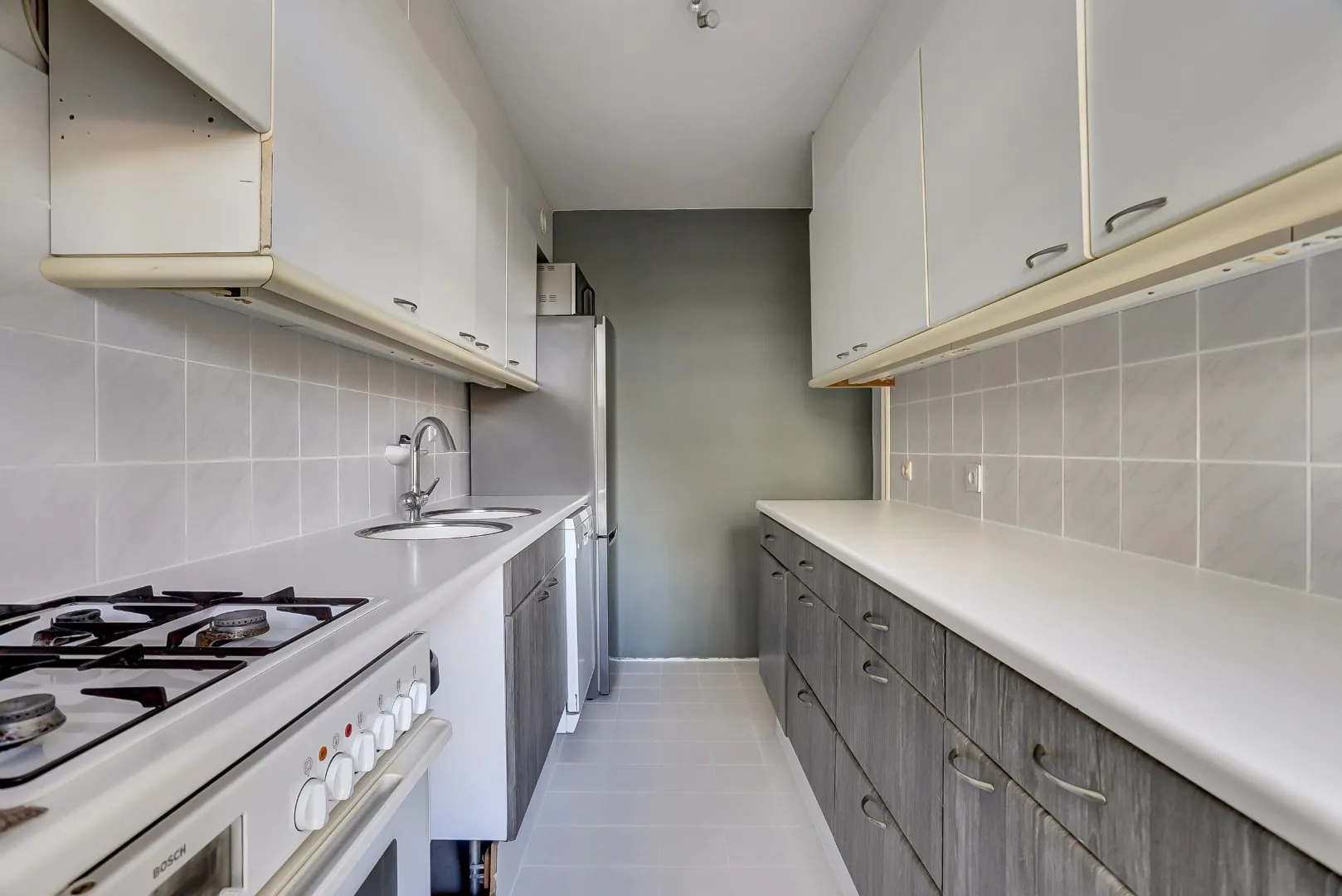 De lichte woon-/eetkamer heeft een mooie, ruime indeling met een laminaatvloer en keurige wand- en plafondafwerking. Vanuit hier heeft u toegang tot het zonnige balkon op het westen, met uitzicht op de gemeenschappelijke tuin. Een heerlijke plek om van de middag- en avondzon te genieten. De dichte keuken in rechte opstelling is voorzien van diverse apparatuur, waaronder een gasfornuis met oven, vaatwasser en aansluitingen voor wasmachine en droger.