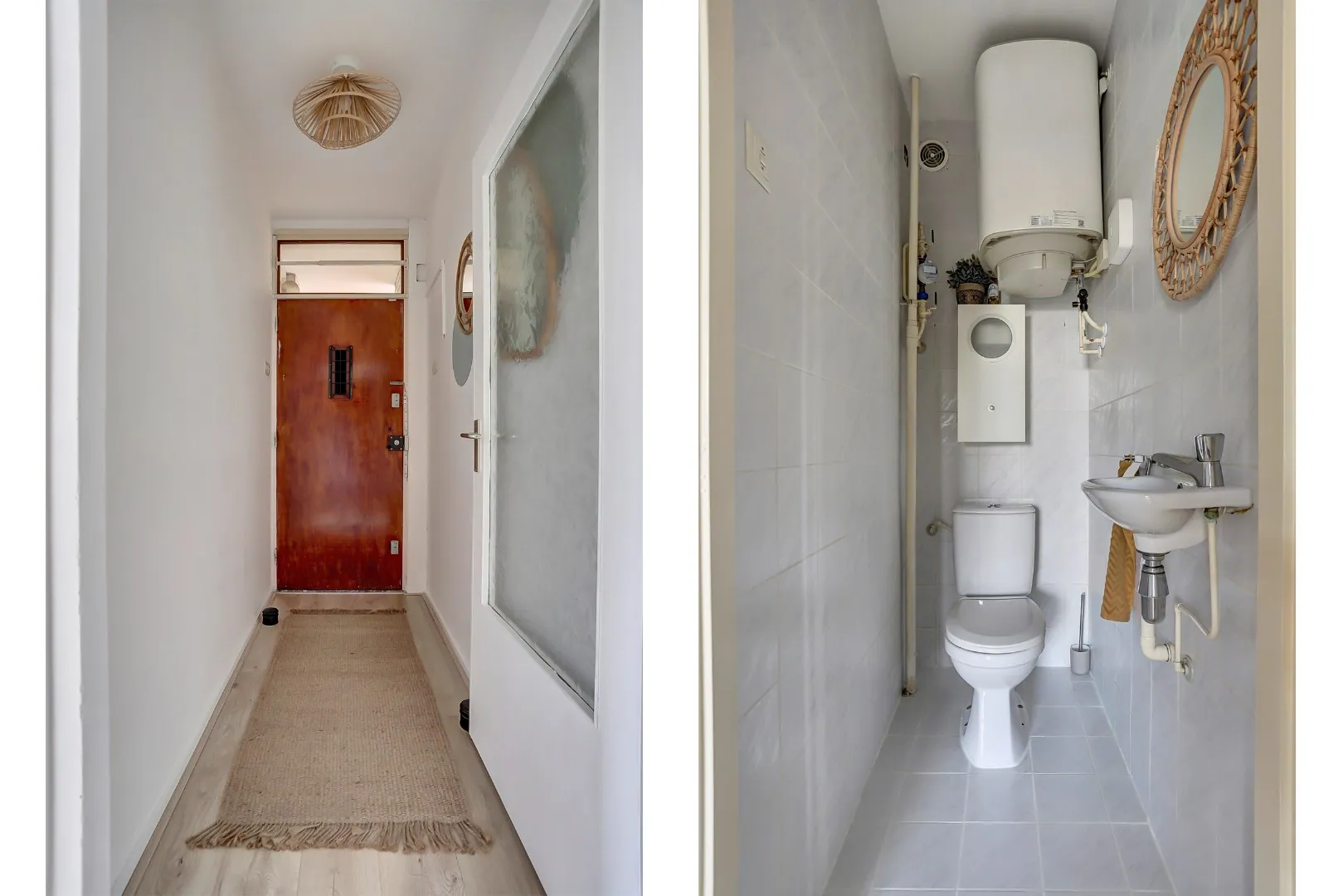 Entree met tochtportaal, hal met meterkast, vaste kast en toiletruimte welke geheel betegeld is en beschikt over een fonteintje. Hier bevindt zich tevens de opstelplaats voor de boiler.