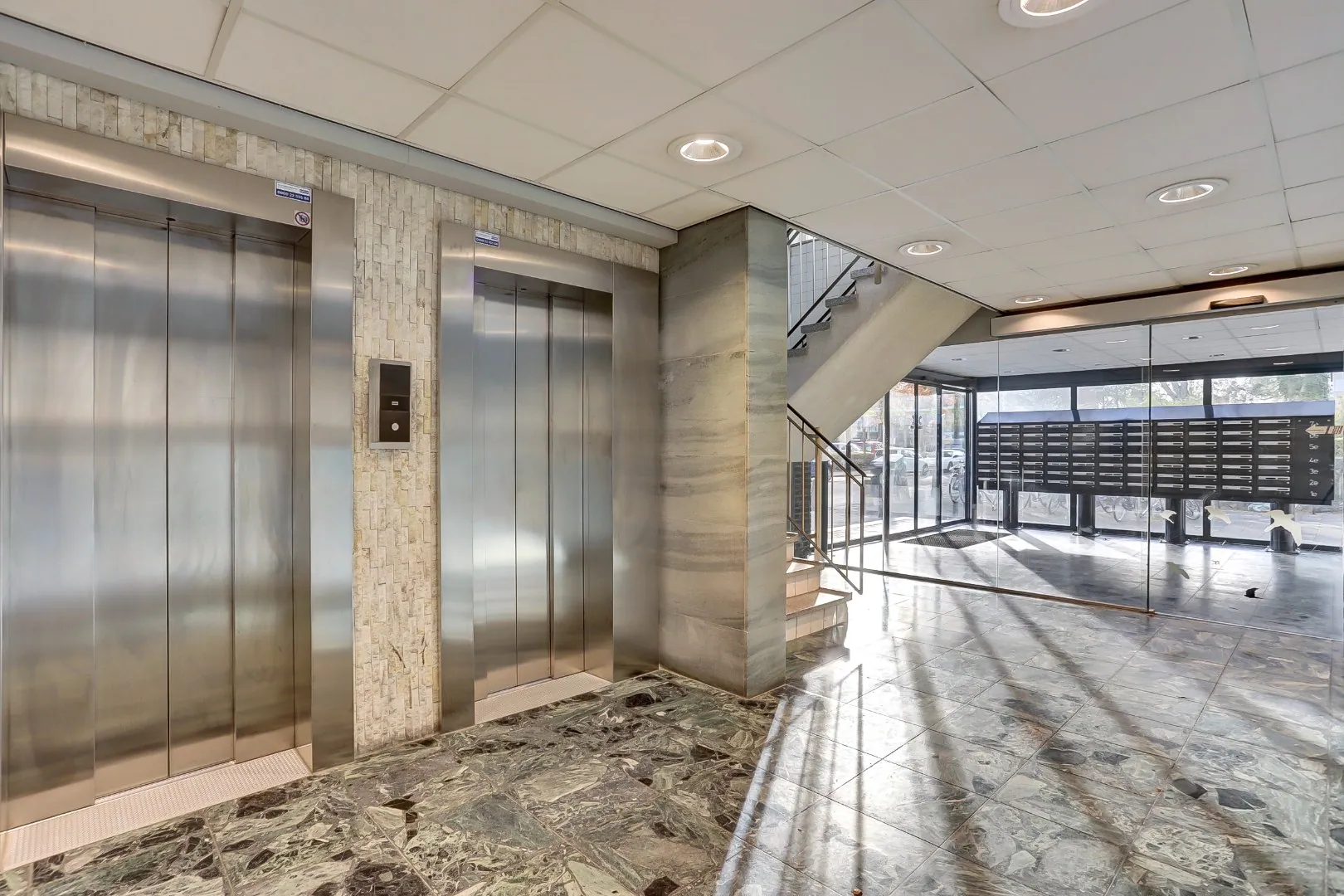 Afgesloten entree met brievenbussen, videobellentableau, twee nieuwe liften, trappenhuis en toegang tot de bergingen.