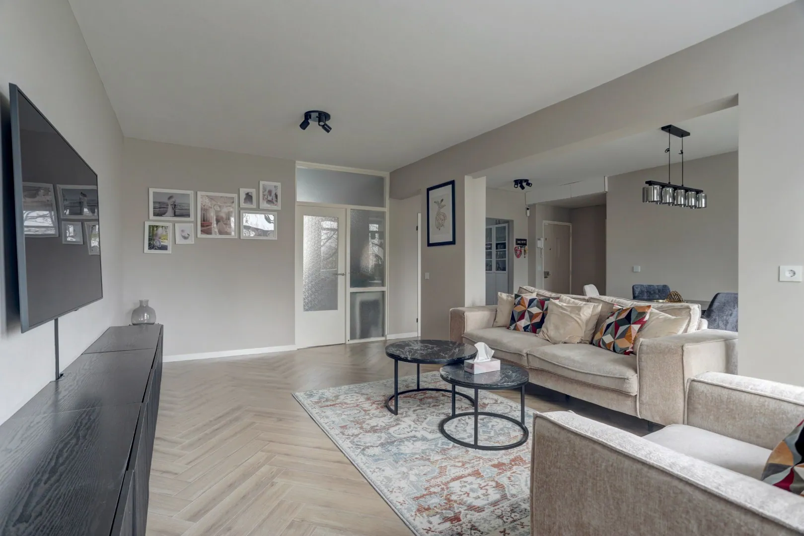 De strak afgewerkte woonkamer en eetkamer vormen samen een royale, open living van 21 m², met een fraaie visgraatvloer en veel daglicht dankzij de grote raampartijen. Vanuit de living stapt u zo het balkon op, gelegen op het oosten, met een groen uitzicht.