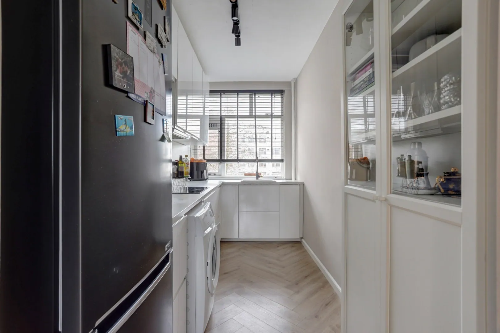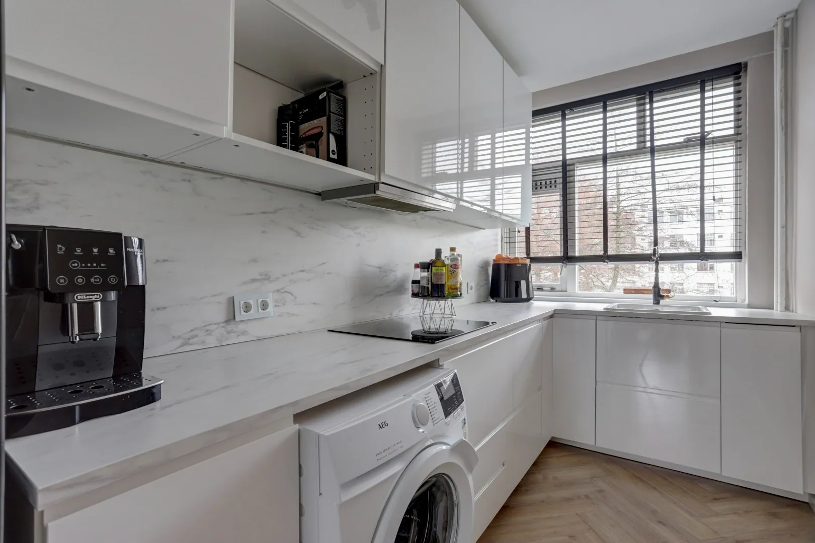 De moderne, witte L-vormige keuken is uitgerust met inbouwapparatuur, zoals een afzuigkap, vaatwasser en aansluiting voor de wasmachine.