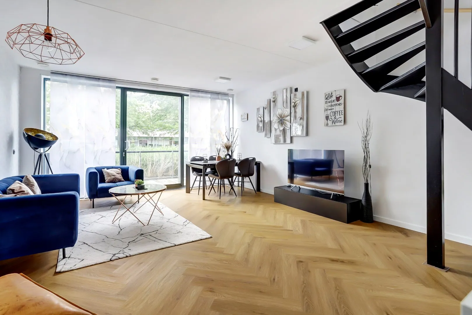De living beschikt over een mooie fraaie pvc vloer en veel grote raampartij waardoor er in de woning veel natuurlijk licht valt.