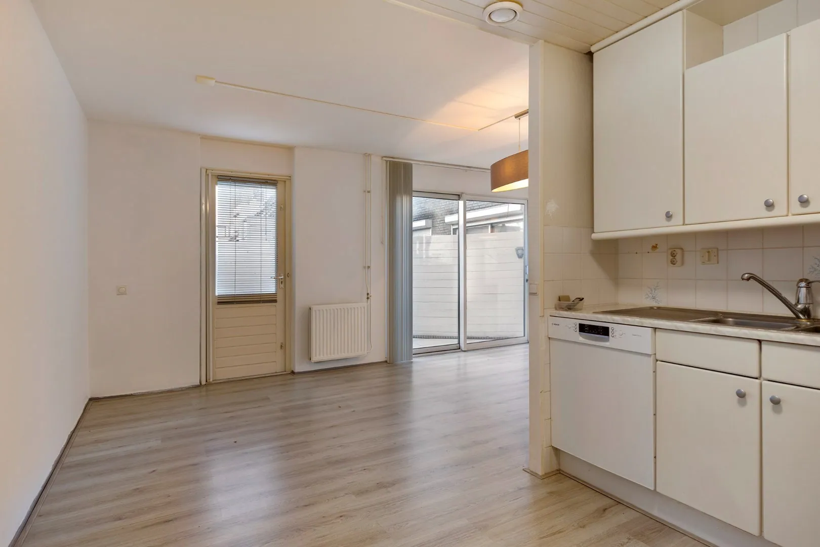 De lichte, speels ingedeelde woonkamer biedt volop leefruimte en staat in directe verbinding met de fraai aangelegde achtertuin dankzij de schuifpui én een extra deur.