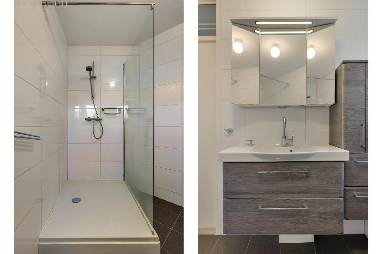 De luxe badkamer is geheel betegeld en uitgerust met een moderne inloopdouche, tweede wandcloset, een fraai badkamermeubel met spiegel en een designradiator – een heerlijke plek om te ontspannen.