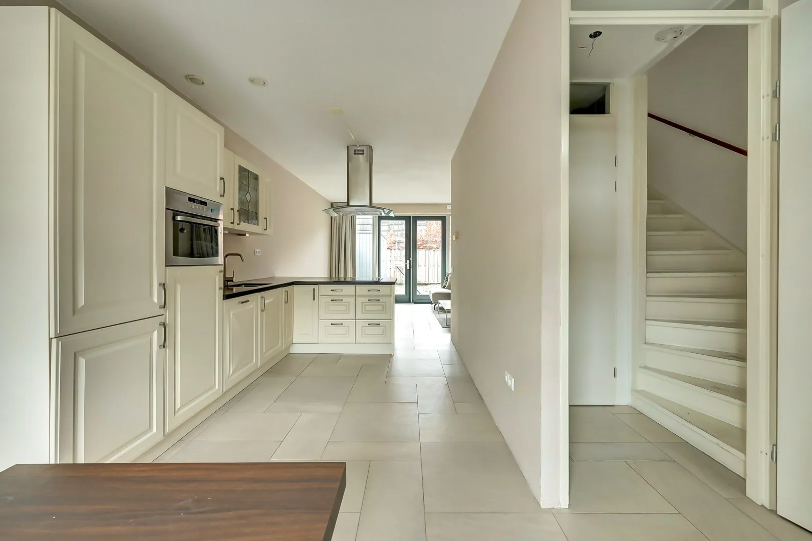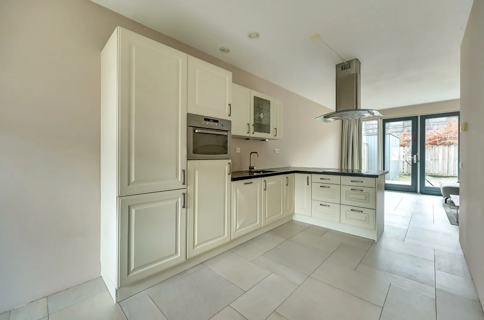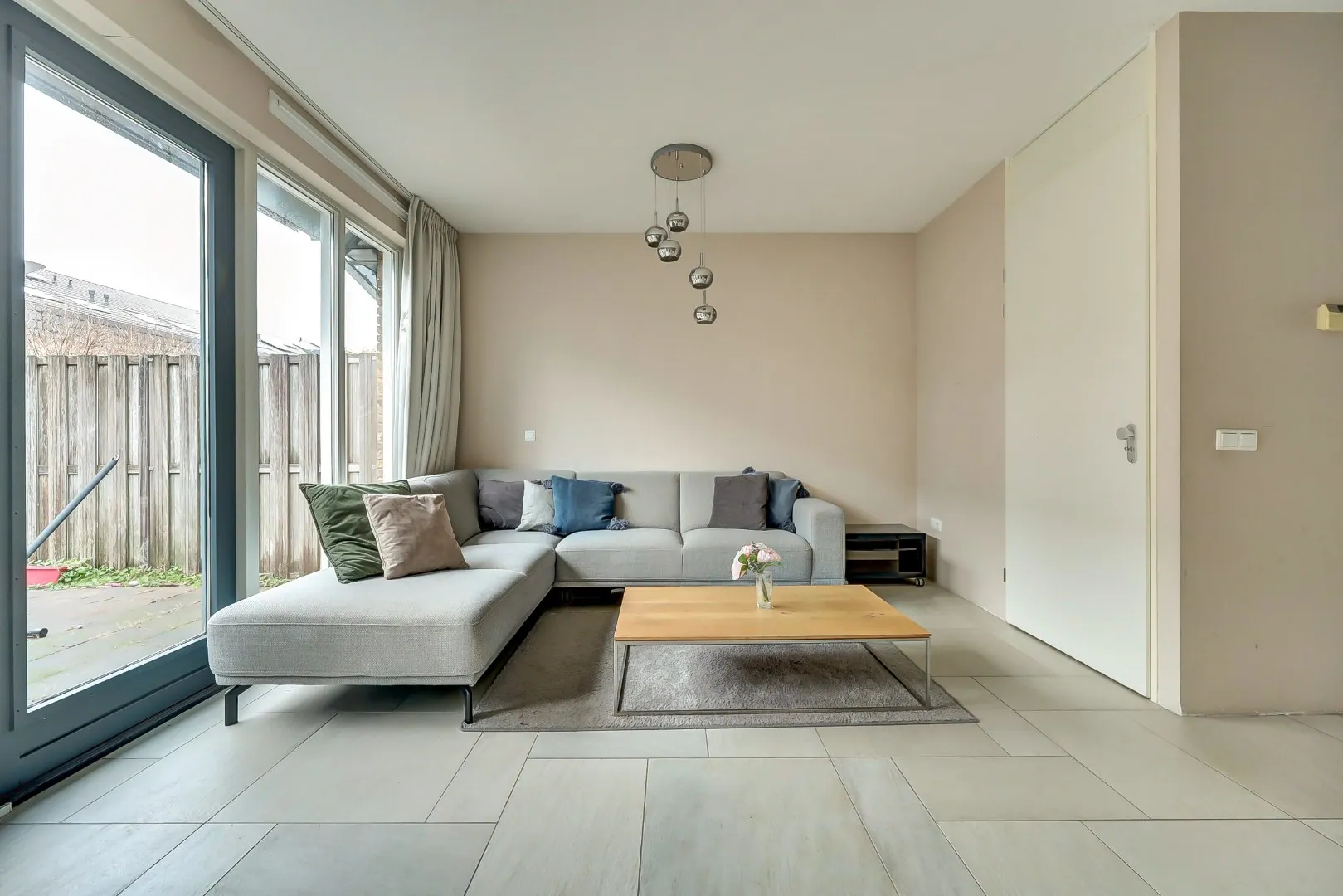 Aan de achterzijde ligt de ruime woonkamer met vaste bergkast en openslaande deuren naar de zonnige achtertuin met zonnescherm, houten berging en achterom. De begane grond heeft een royale living van circa 40 m² en is afgewerkt met een tijdloze plavuizenvloer met vloerverwarming. In de tussenhal bevinden zich het toilet met fonteintje en de trap naar de eerste verdieping.
