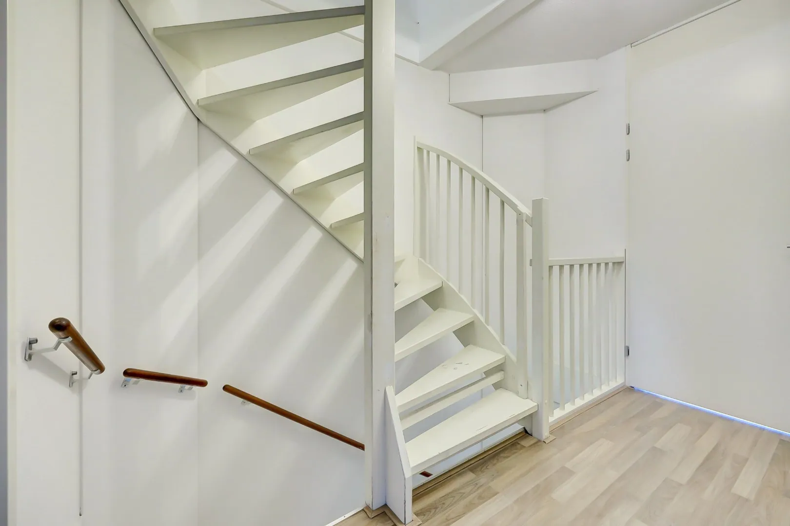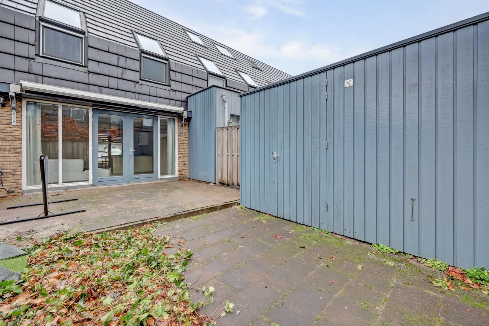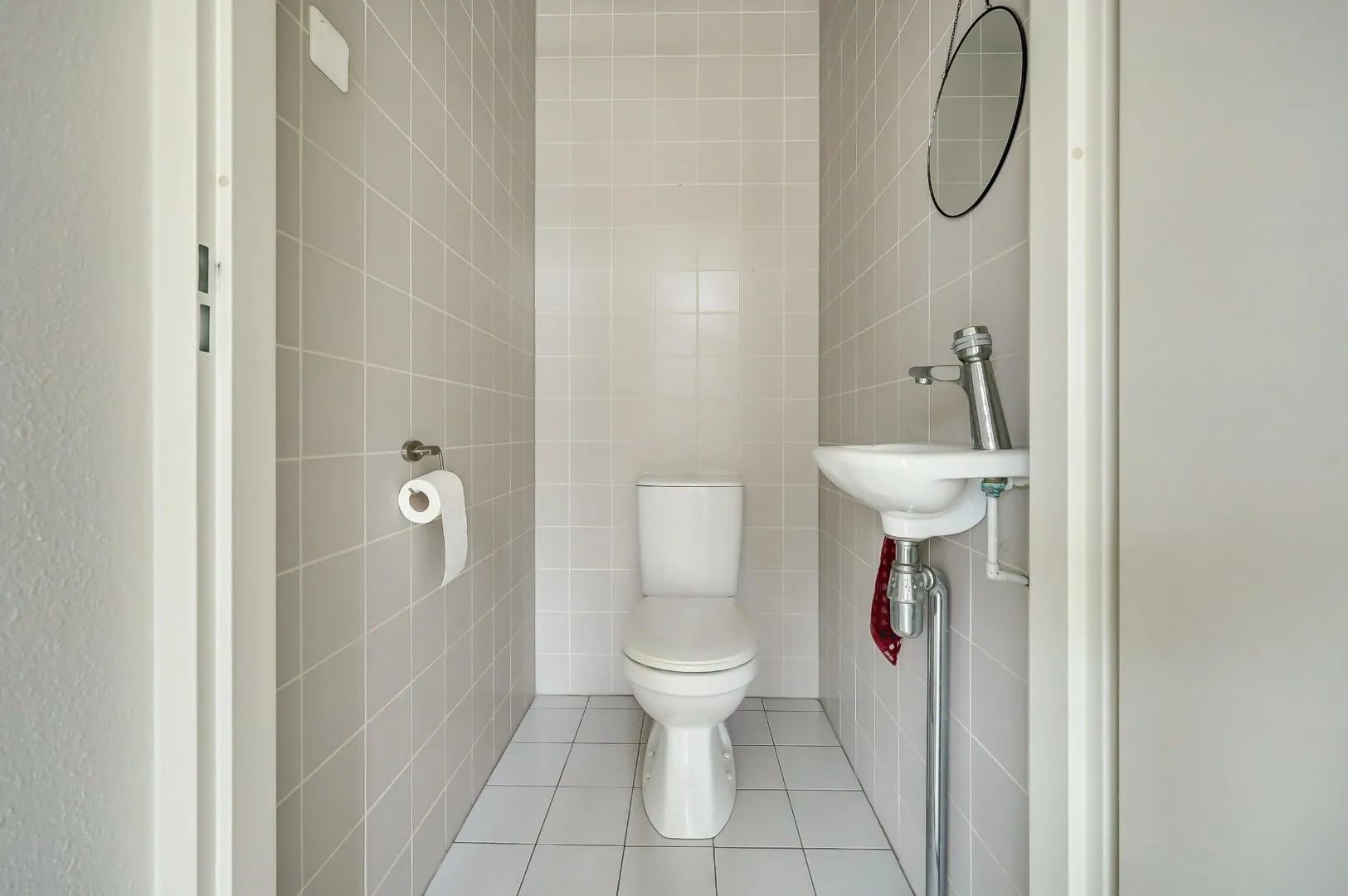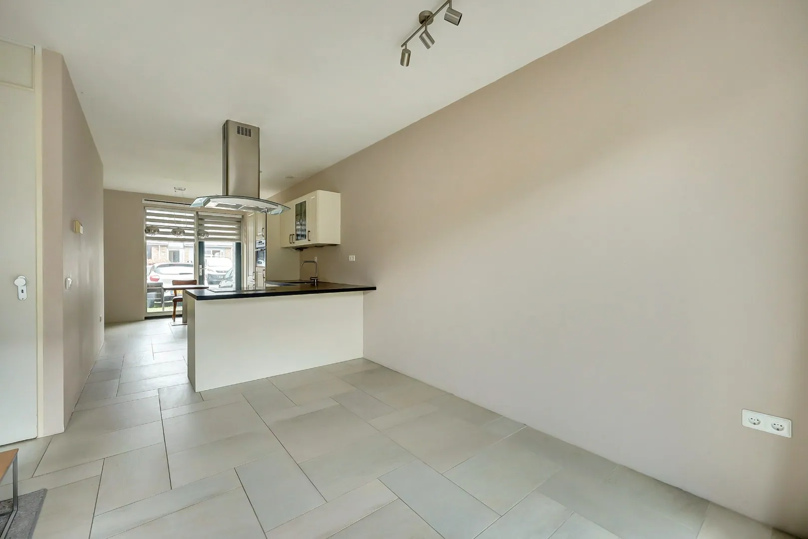 Aan de achterzijde ligt de ruime woonkamer met vaste bergkast en openslaande deuren naar de zonnige achtertuin met zonnescherm, houten berging en achterom. De begane grond heeft een royale living van circa 40 m² en is afgewerkt met een tijdloze plavuizenvloer met vloerverwarming. In de tussenhal bevinden zich het toilet met fonteintje en de trap naar de eerste verdieping.