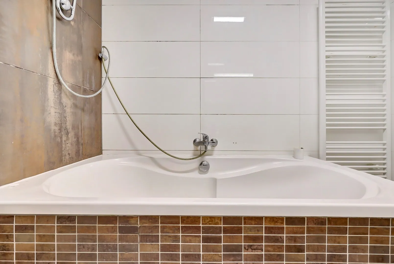 De volledig betegelde badkamer is uitgerust met een ligbad met douchescherm, wastafelmeubel met spiegel en een tweede toilet.