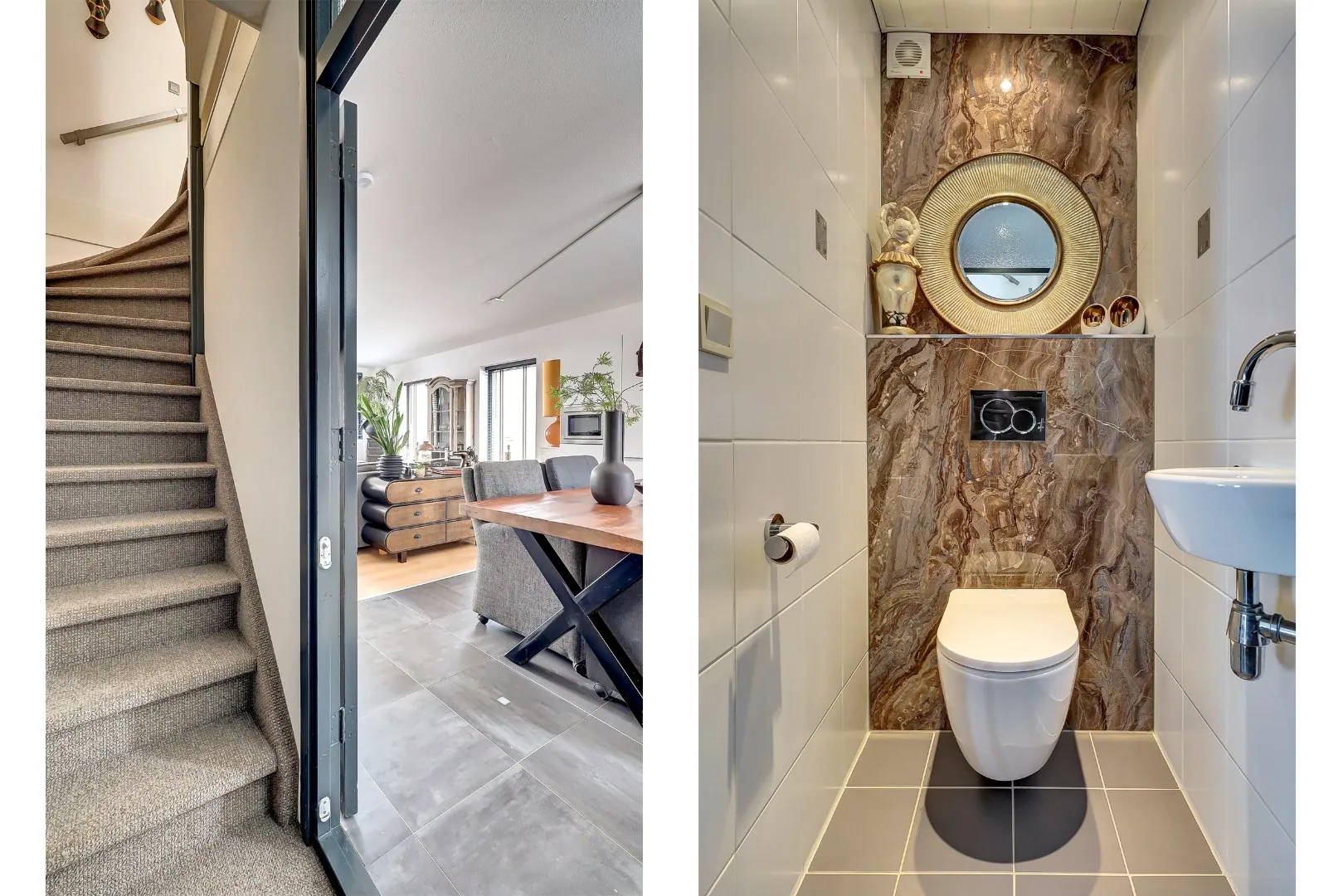 Moderne toiletruimte welke geheel is betegeld en voorzien van een wandcloset met fonteintje.