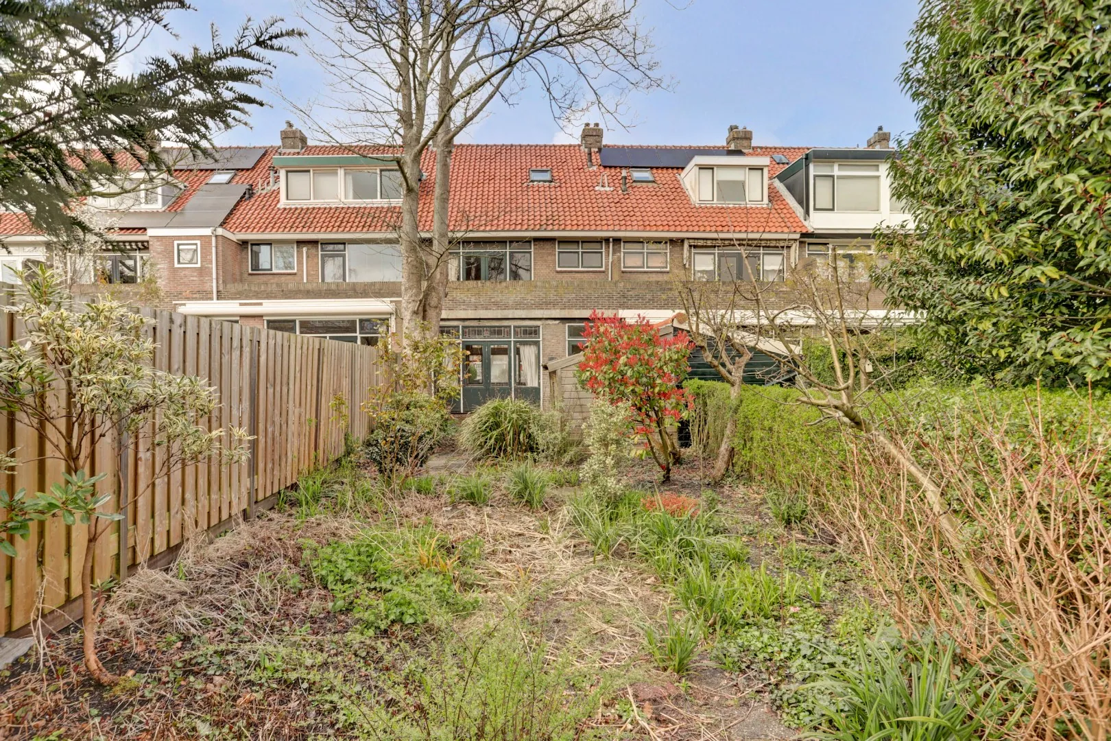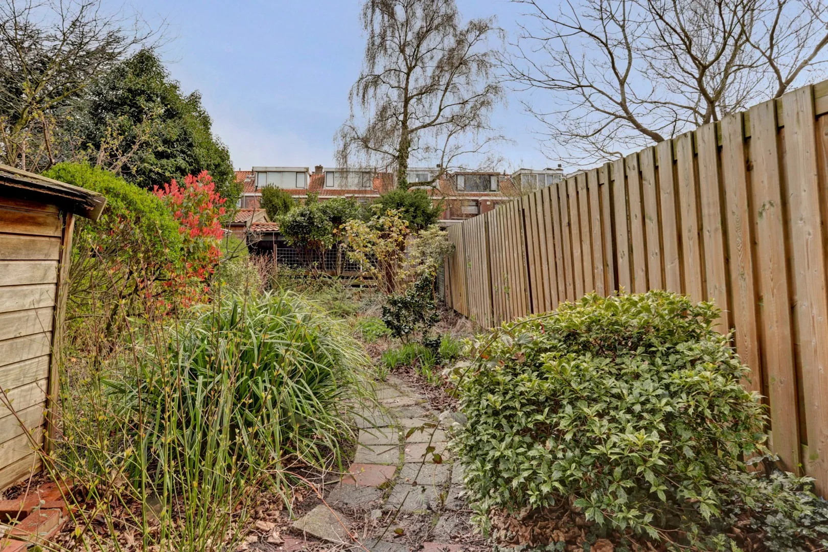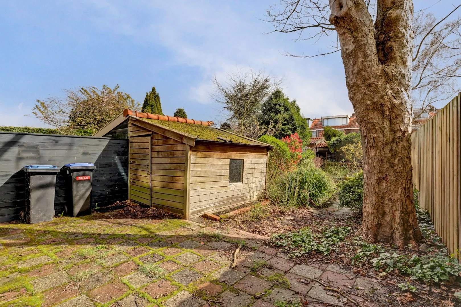 De achtertuin van 20 meter is gelegen op het zonnige zuidoosten en beschikt over een houten berging en een handige achterom.