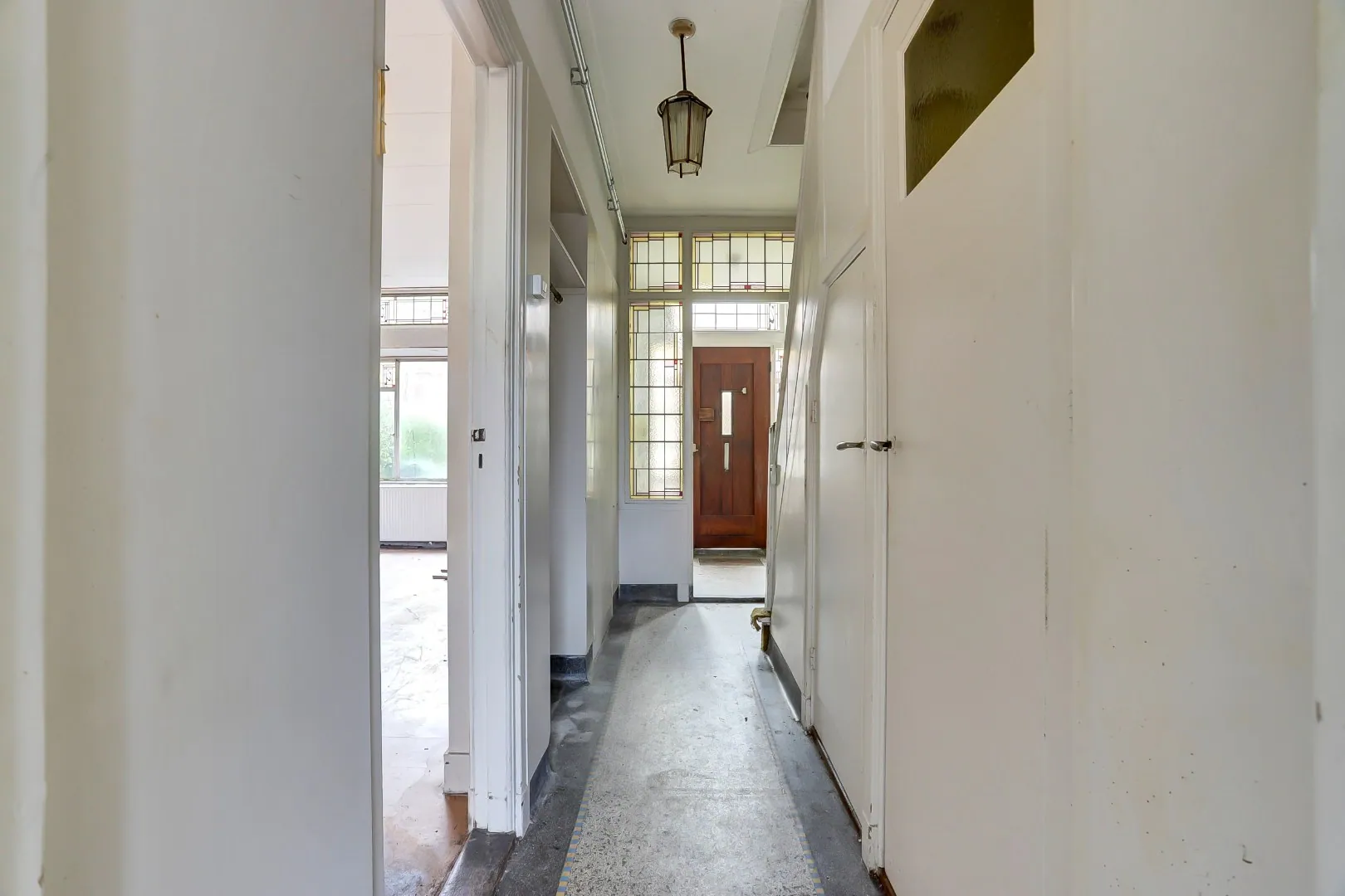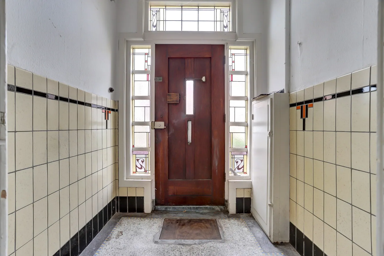Entree, vestibule met granieten vloer, authentiek tegelwerk en glas-in-loodramen. Hal met granieten vloer, vaste kast en trapopgang naar de eerste verdieping. Vanuit de hal heeft u toegang tot zowel de originele keuken als de woonkamer.