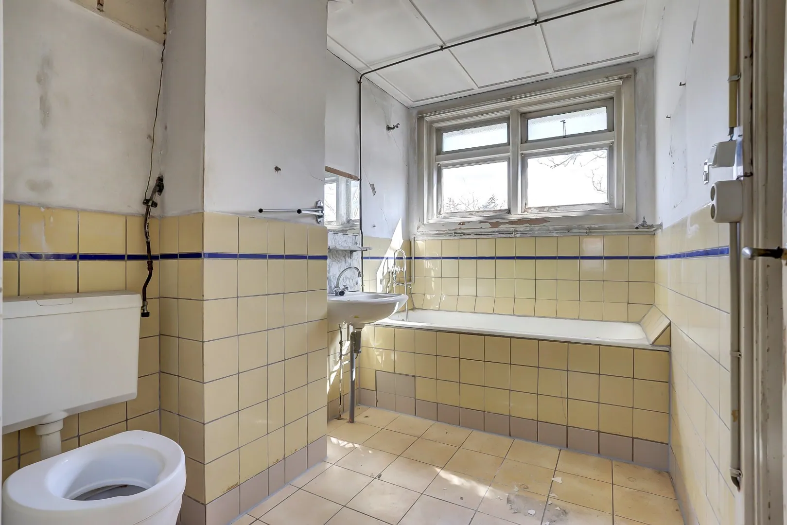 De badkamer is nog van authentieke tegels voorzien en uitgevoerd met een ligbad, tweede toilet en wastafel.