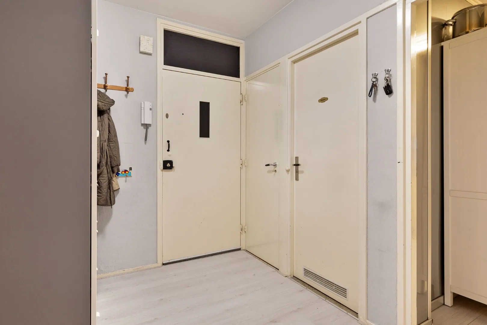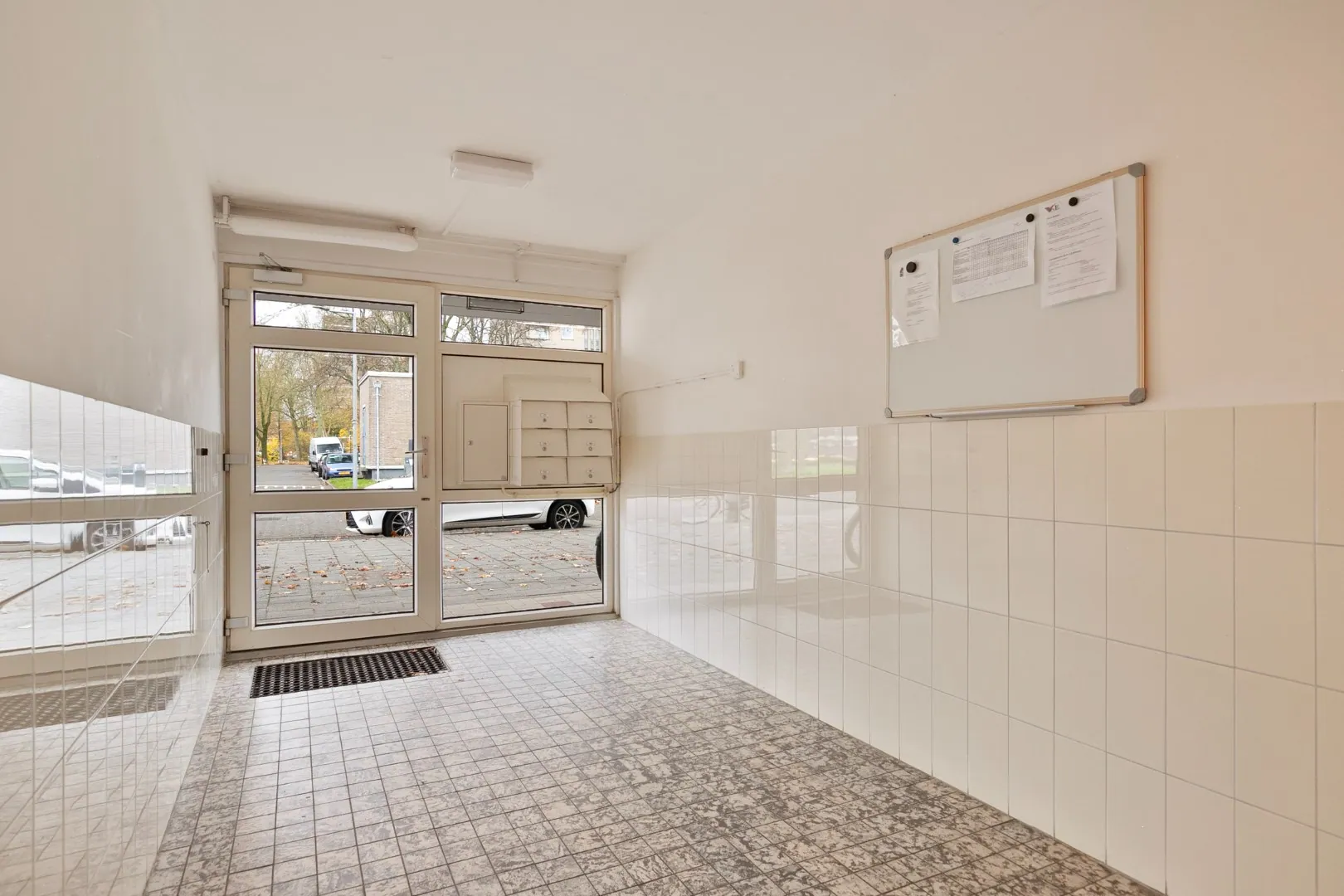 Afgesloten portiek met brievenbussen en bellentableau. Toegang tot het trappenhuis en de ruime berging.