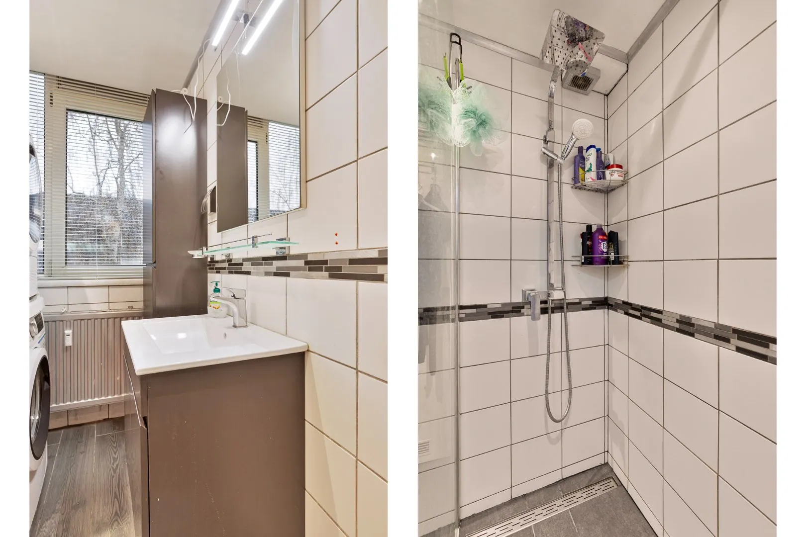 De ruime, fraai afgewerkte badkamer is voorzien van een douchecabine met regen- én handdouche, een stijlvol wastafelmeubel, opbergkast en de opstelplaats voor de wasmachine en droger. Alles wat u nodig hebt voor optimaal wooncomfort!