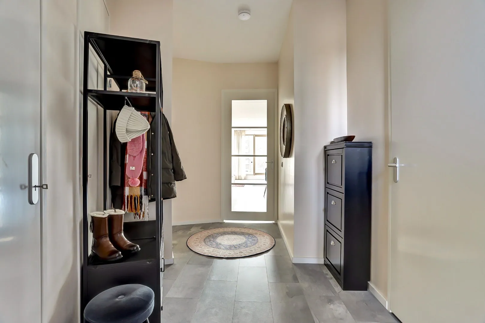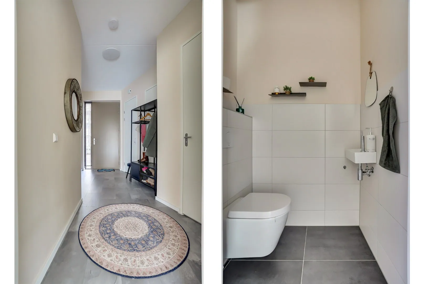 Entree, hal met toegang tot de vertrekken. Toilet met wandcloset en fonteintje. De berging beschikt over de aansluitingen voor de wasmachine en droger.