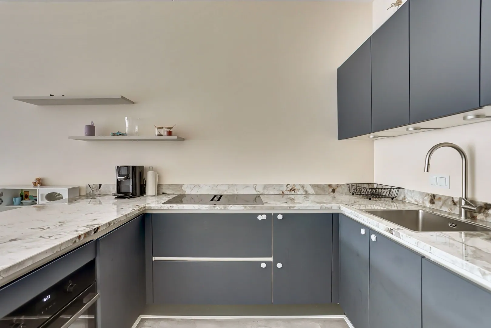 De open keuken is in een U-vorm gerealiseerd en voorzien van diverse inbouwapparatuur zoals; koel/vriescombinatie, inductie kookplaat met geïntegreerde afzuiging, oven en vaatwasser.