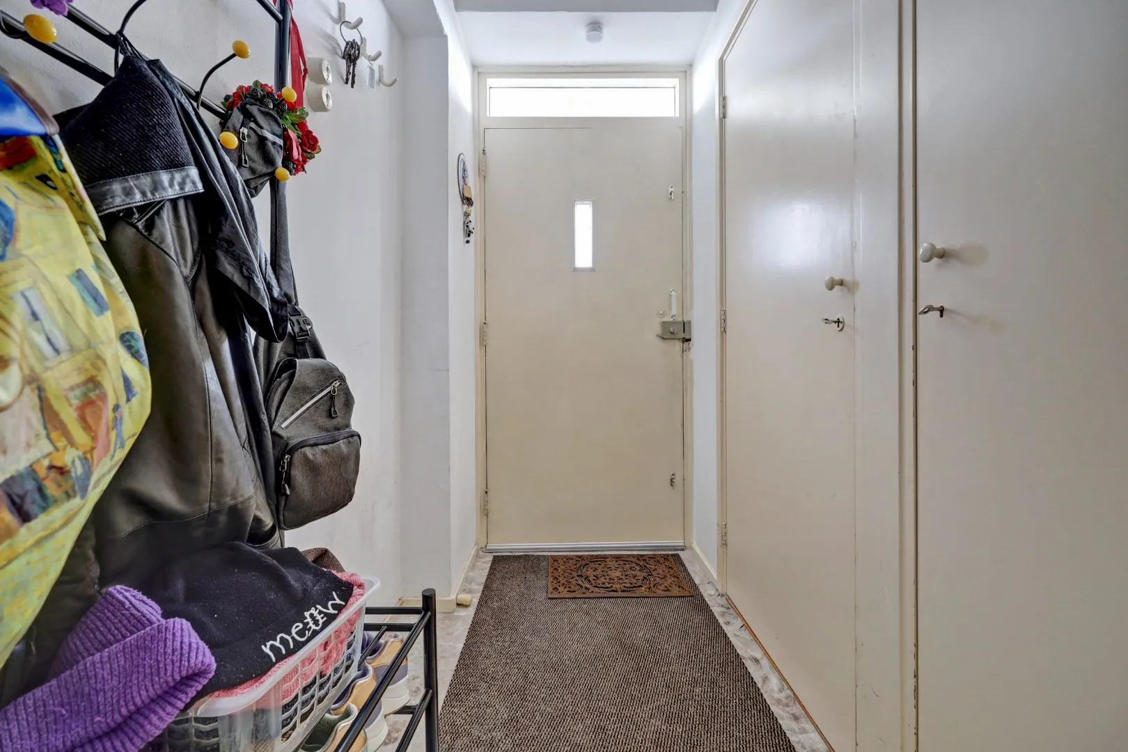 Entree, hal die toegang geeft tot alle vertrekken. Daarnaast is er een deels betegelde toiletruimte met fonteintje.
