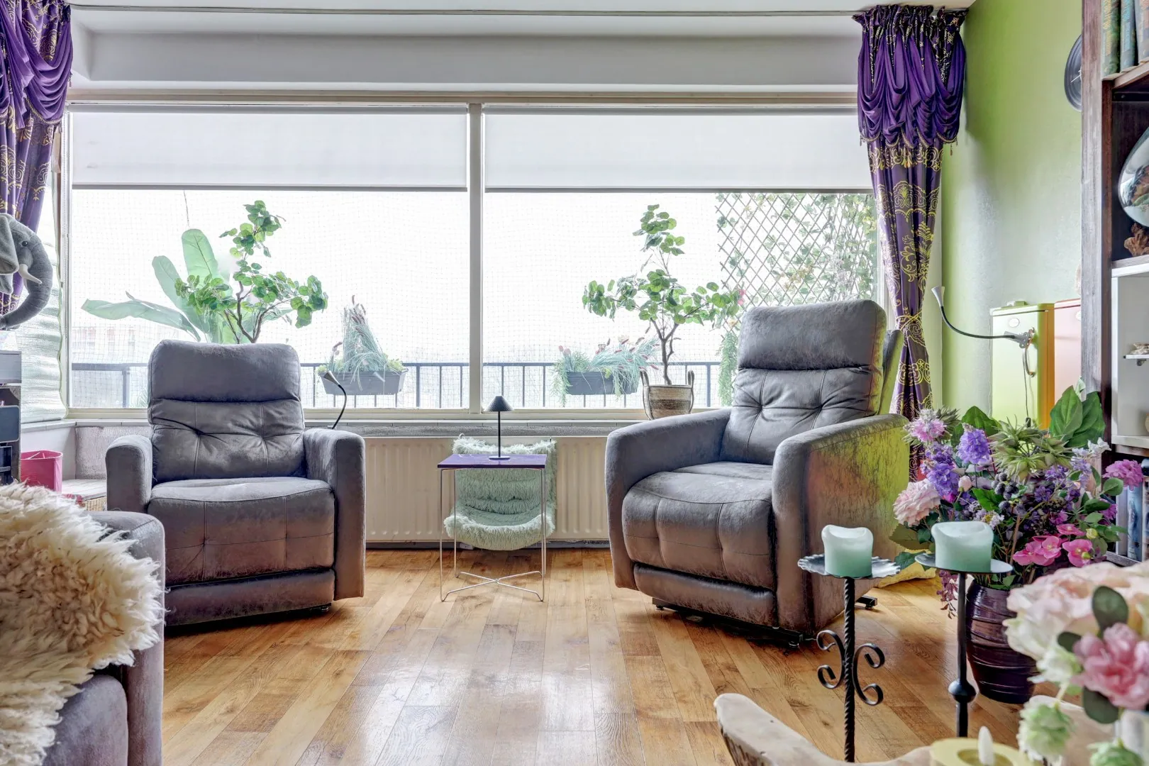 De woonkamer is vergroot door samentrekken met een slaapkamer, dankzij de grote raampartijen geniet u hier van volop licht. Vanuit de woonkamer heeft u toegang tot het zonnige balkon.
