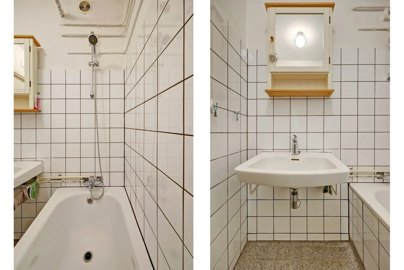 De badkamer is gedateerd doch voorzien van een ligbad met handdouche en een wastafelmeubel met spiegel.