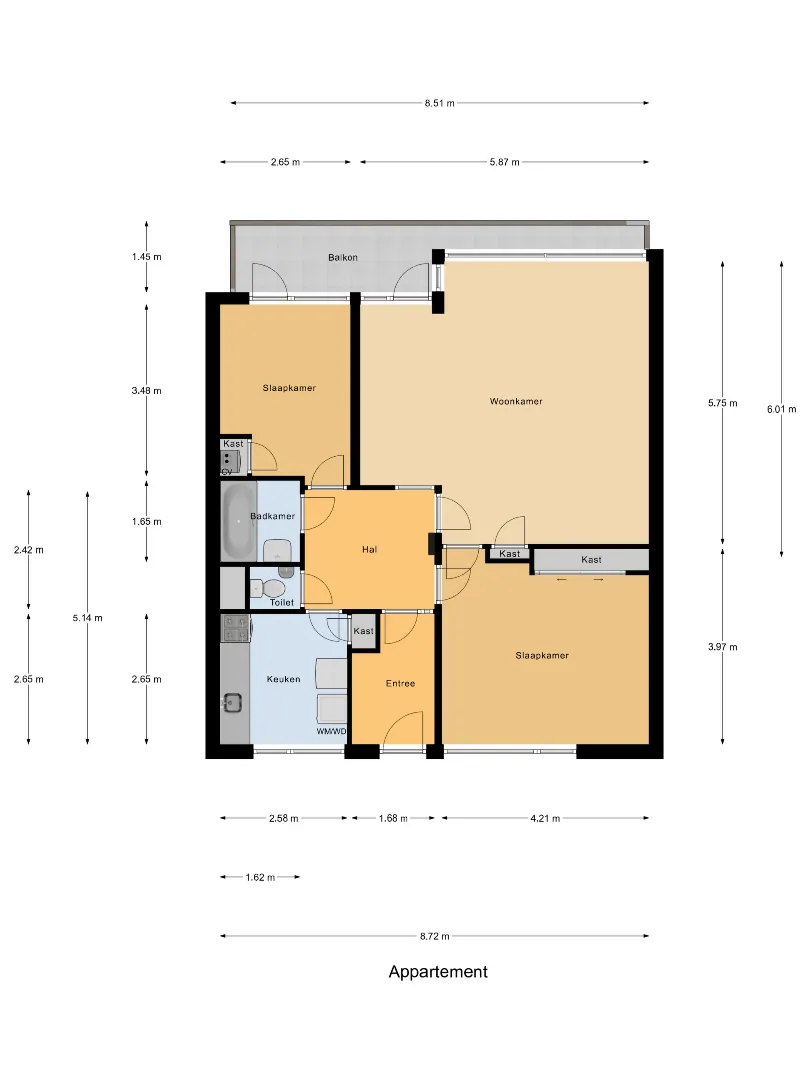 Het appartement beschikt over twee slaapkamers, de eerste slaapkamer bevindt zich aan de voorzijde met vaste kasten. De tweede slaapkamer, aan de achterzijde en geeft u directe toegang tot het balkon, tevens is in de vaste kast de opstelplaats van de boiler.