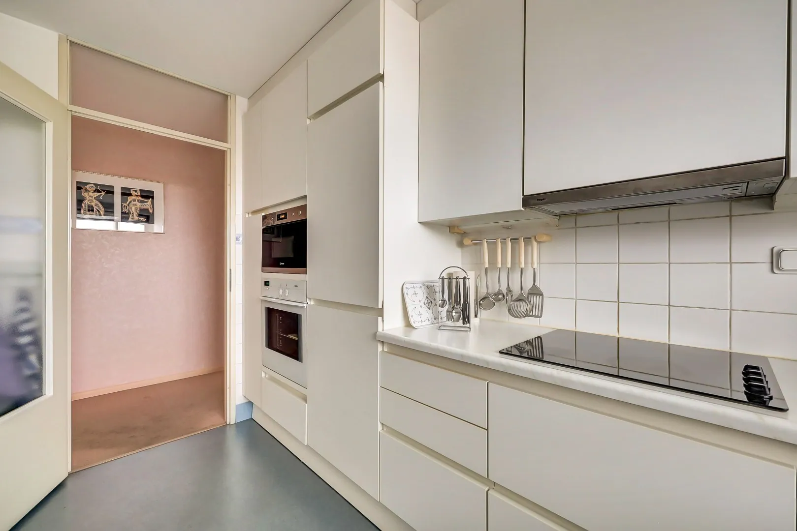 De keuken is voorzien van een L-vormig keukenblok met diverse inbouwapparatuur, waaronder een inductiekookplaat, afzuigkap, oven, magnetron, vaatwasser en een koel-/vriescombinatie.