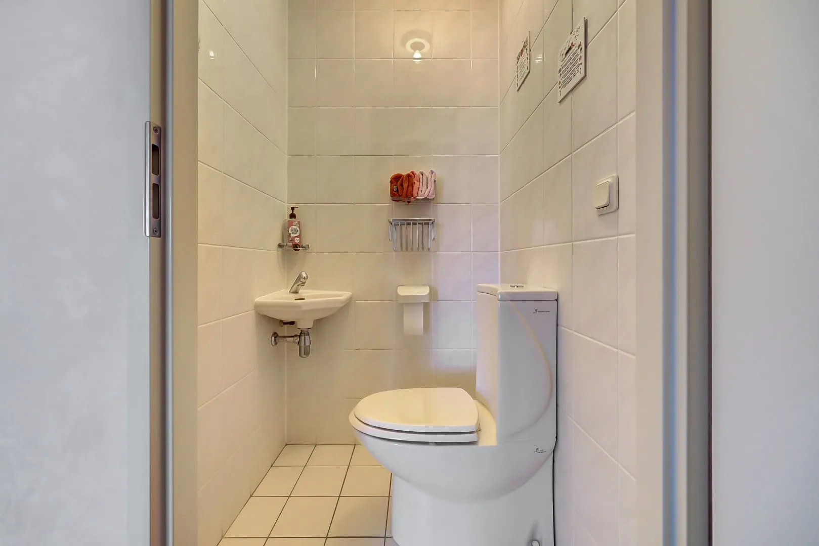Entree, hal met meterkast, vaste kast met opstelplaats Cv-ketel en voorraadkast. Het toilet met fonteintje is volledig betegeld.