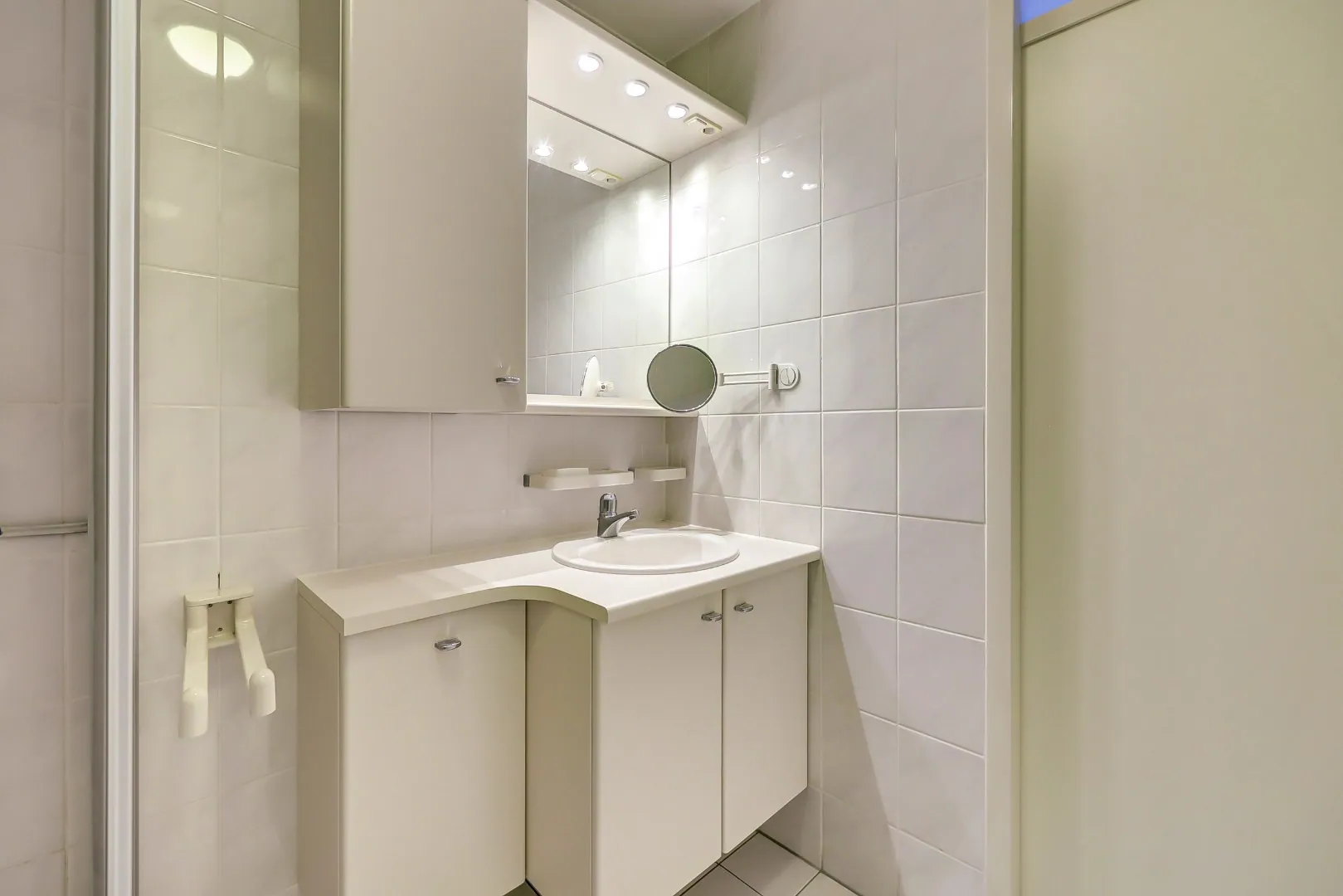 De eerste badkamer is voorzien van een douchecabine met handdouche, tweede toilet (sanibroyeur), wastafelmeubel, spiegel met kastruimte en inbouwspots.