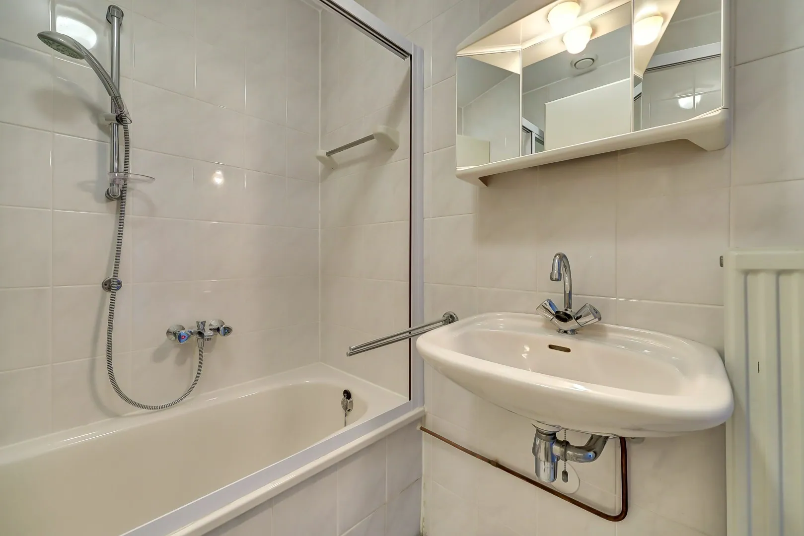 De tweede badkamer beschikt over een ligbad met handdouche, wastafel met spiegel, handdoekenkast én een aansluiting voor de wasmachine.