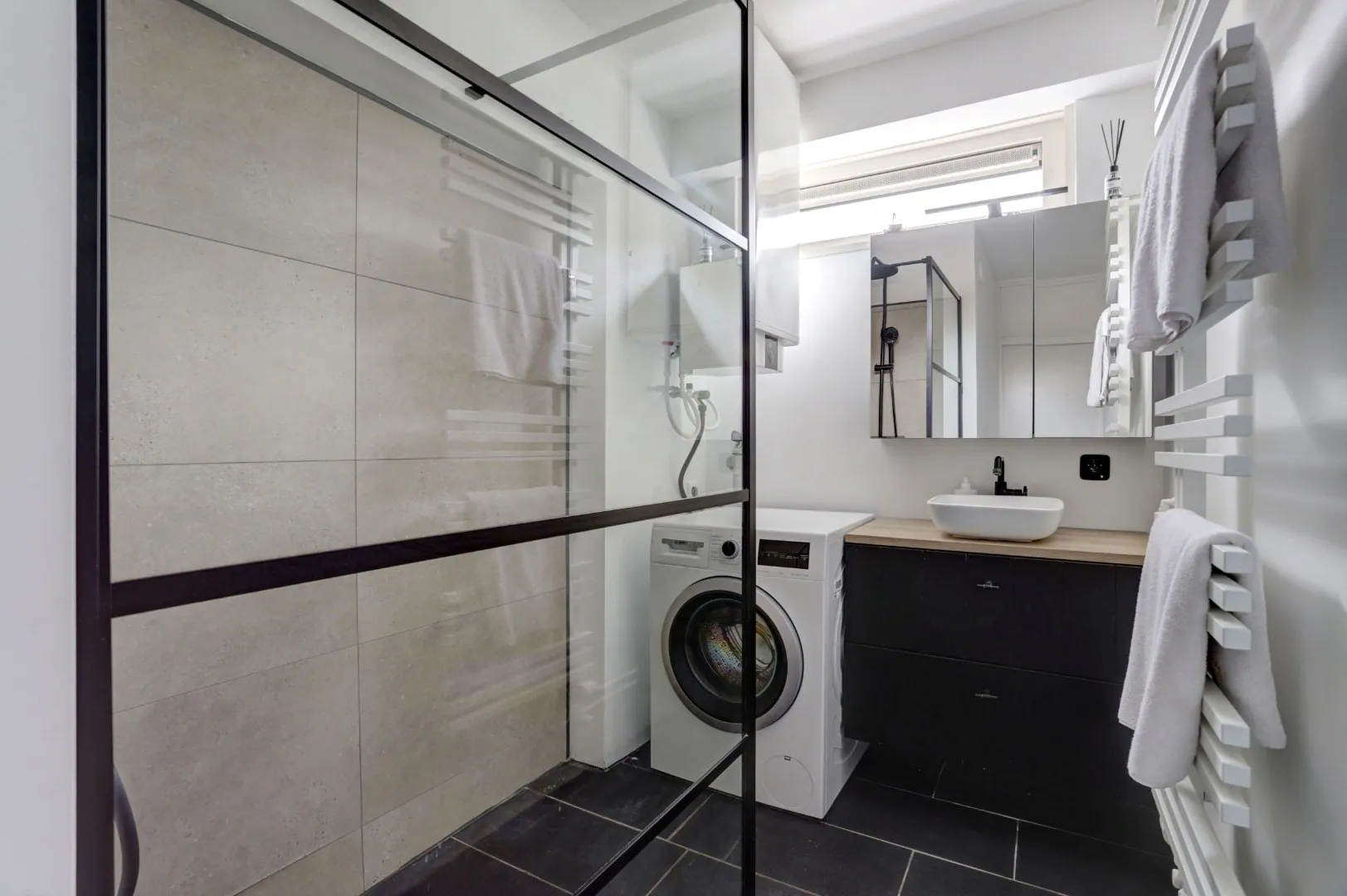 De ruime en moderne badkamer (2021) is volledig betegeld en van alle gemakken voorzien. Zo is de badkamer voorzien van een inloopdouche met regen- en handdouche, een strak vormgegeven wastafel met spiegel, een aansluiting voor de wasmachine, een designradiator en de opstelplaats voor de boiler.