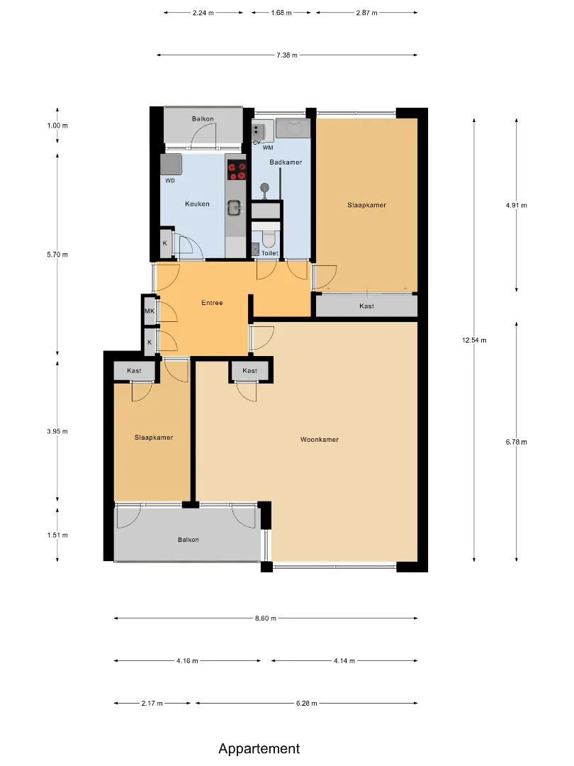 Entree/hal met meterkast, opbergkasten, garderoberuimte en toegang tot alle vertrekken. Links vanuit de hal bevindt zich de keuken. De moderne keuken (2021) in rechte opstelling is voorzien van diverse inbouwapparatuur, waaronder een afzuigkap, inductiekookplaat, koel-/vriescombinatie, combi oven/magnetron, kokend waterkraan en vaatwasser. Vanuit de keuken heeft u toegang tot het balkon (gelegen op het Oosten).
