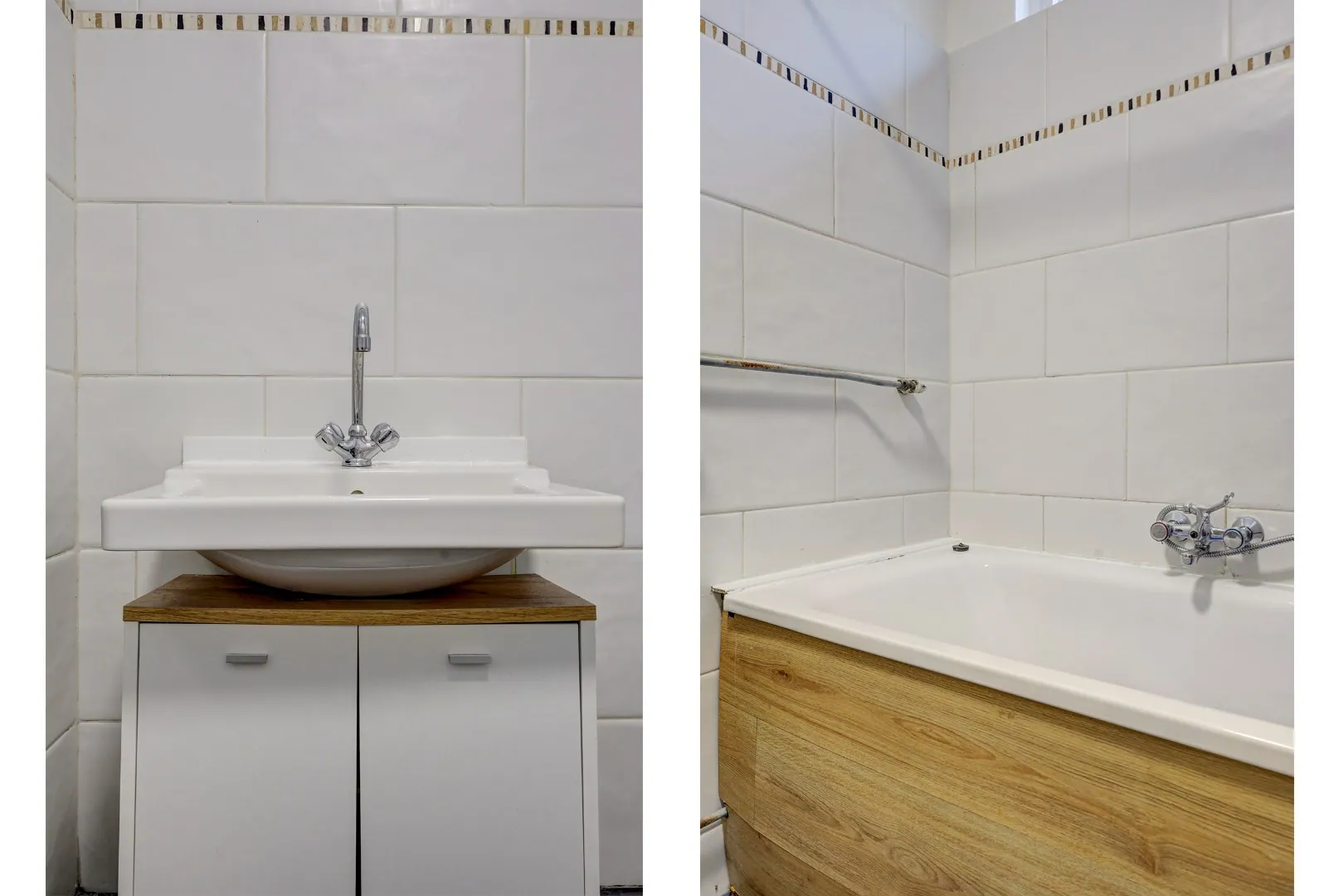 De volledig betegelde badkamer is voorzien van een ligbad met handdouche, en een wastafel met handdoekenkasje tevens is in de badkamer de aansluiting voor de wasmachine.