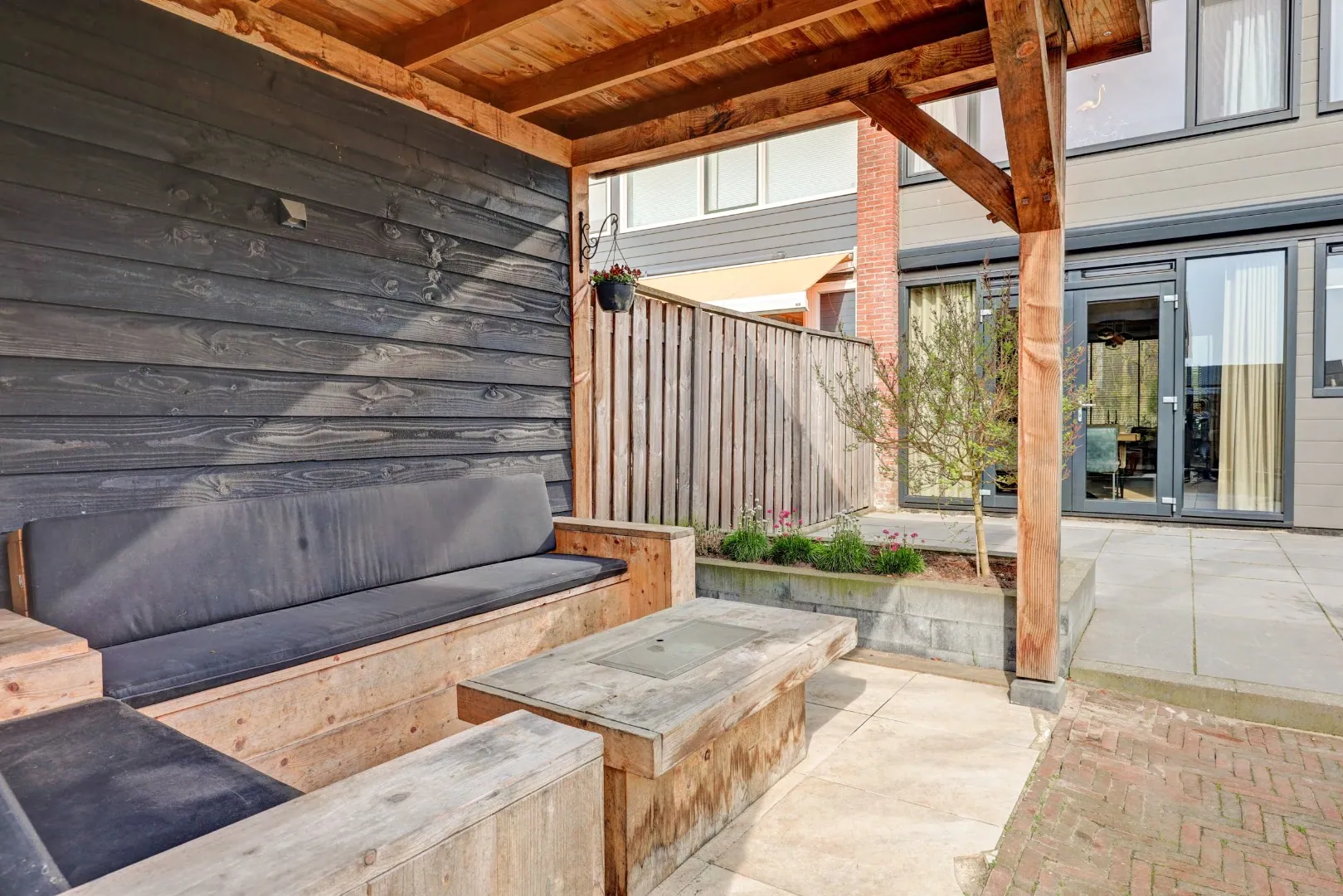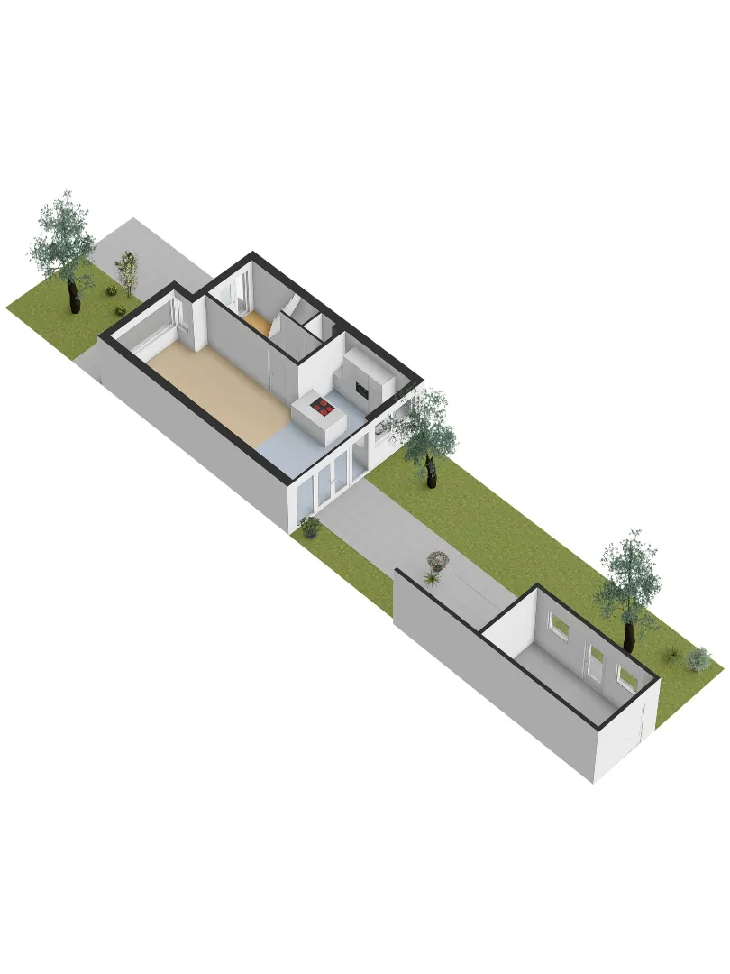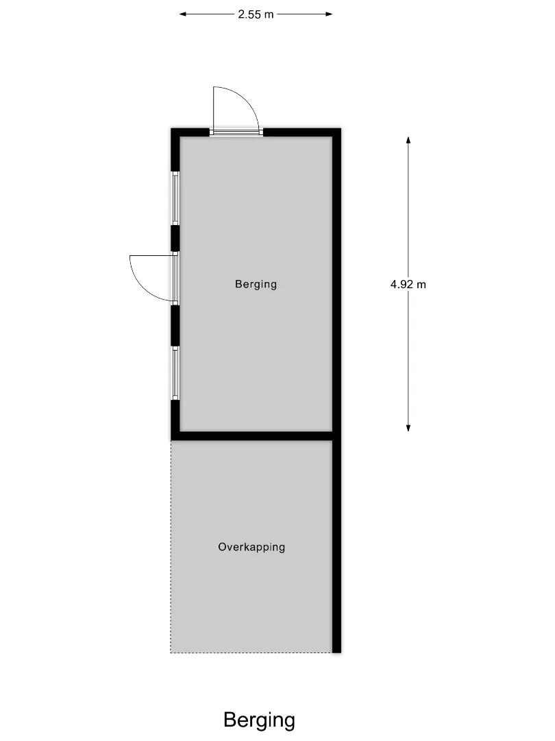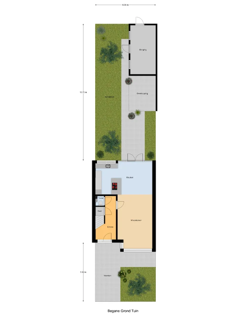 Via de openslaande deuren bereikt u de zonnige achtertuin op het zuidoosten en een handige achterom. Hier geniet u volop van privacy én extra gemak dankzij de praktische berging van ca. 13 m² met overkapping. Ideaal voor fietsen, tuinspullen of als hobbyruimte.