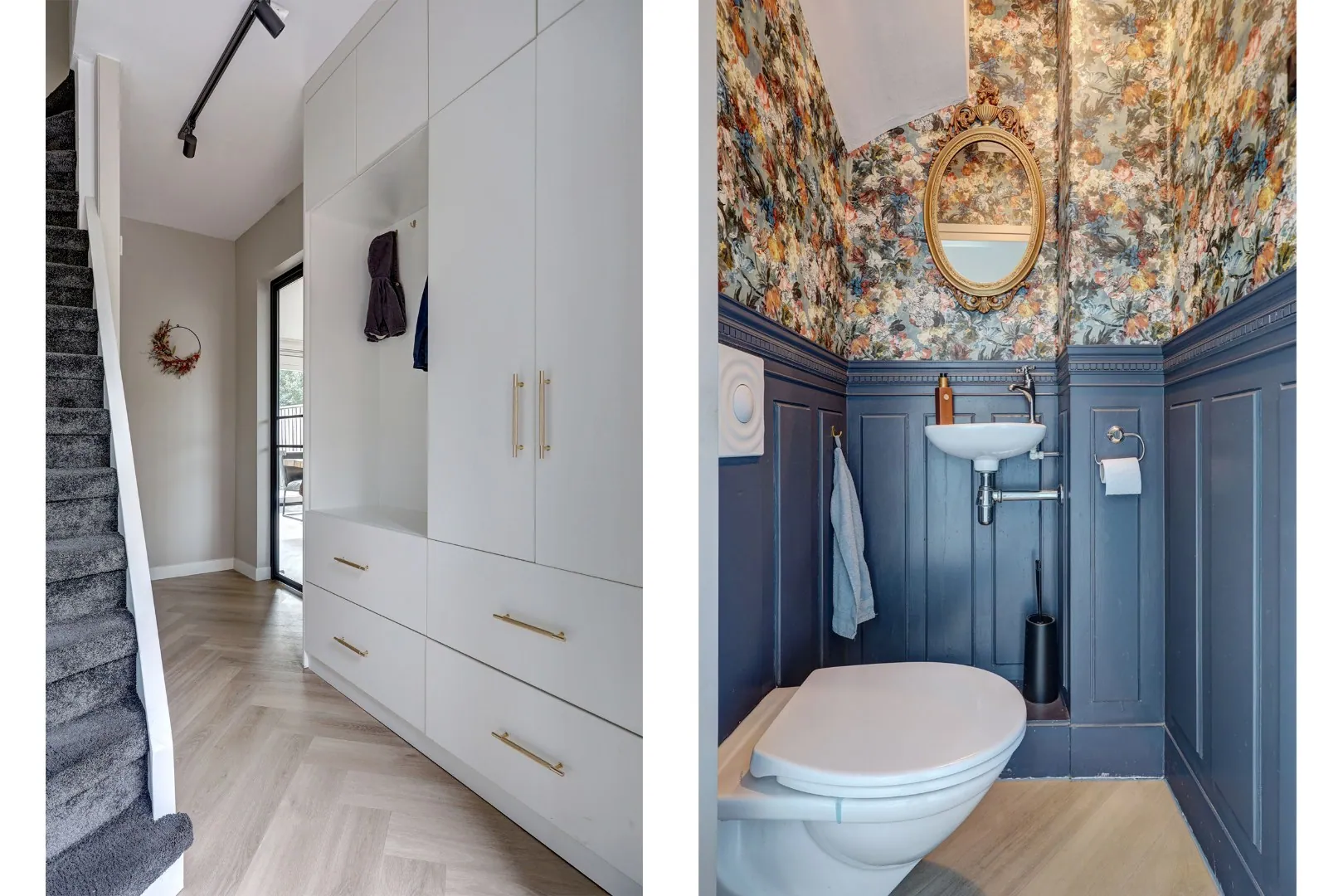Via de verzorgde voortuin stapt u deze ruime en sfeervolle woning binnen. In de hal bevinden zich de trapopgang, een praktische vaste kast en een modern toilet met wandcloset en fonteintje.