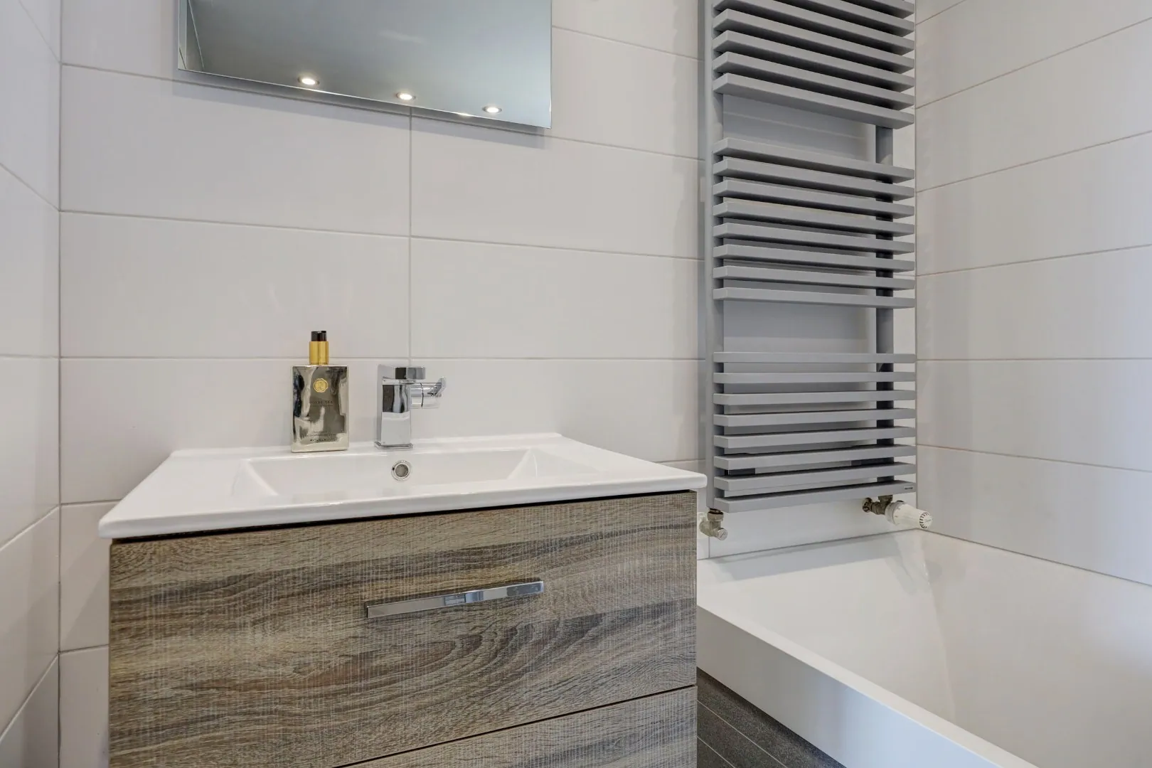 Aan de achterzijde liggen twee slaapkamers allebei met elektrische rolluiken en waarvan één met vaste kast. De derde slaapkamer aan de voorzijde heeft ook een vaste kast en biedt toegang tot het balkon. De badkamer is compleet en netjes afgewerkt, met een ligbad met handdouche, inloopdouche met regendouche en een modern wastafelmeubel.