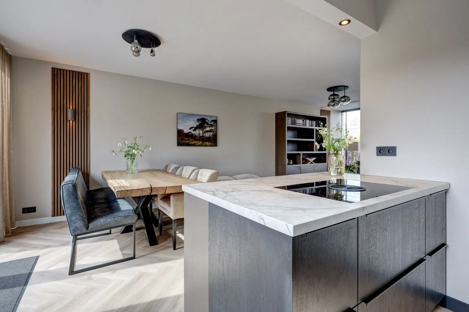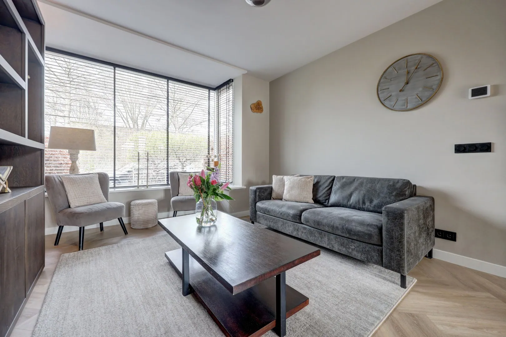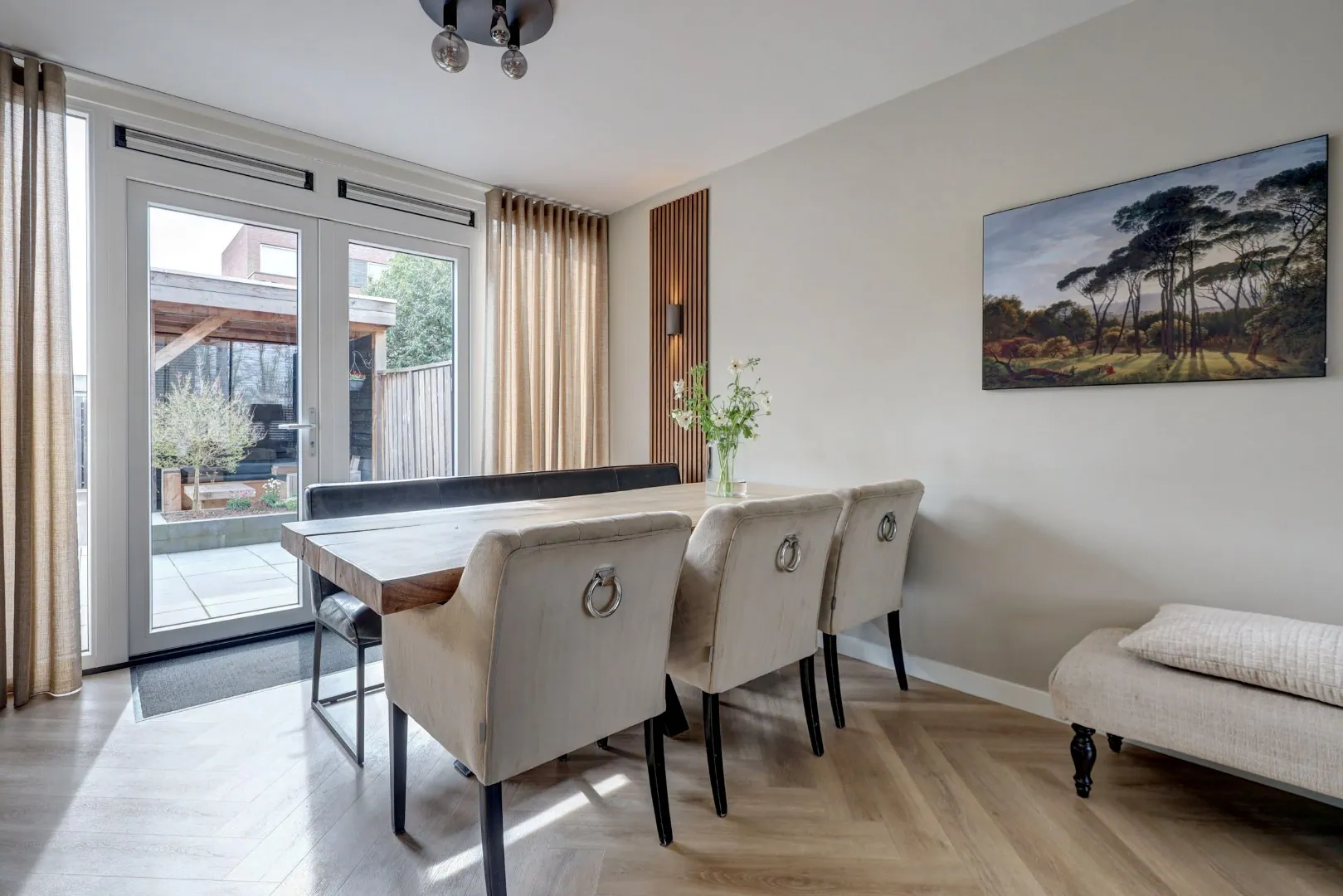 De woonkamer is in 2024 geheel vernieuwd en voelt direct licht en ruim aan dankzij de grote raampartijen. De visgraatvloer en strakke afwerking geven het geheel een luxe, moderne uitstraling. Hier voelt u u meteen thuis!