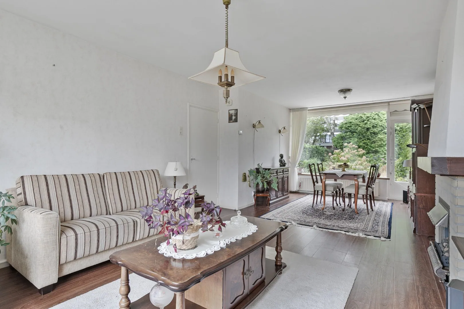 De zeer lichte doorzonwoonkamer 8.07 x 3.94 is voorzien van een laminaatvloer, vaste kast, openhaard en geeft u ook toegang tot de achtertuin.